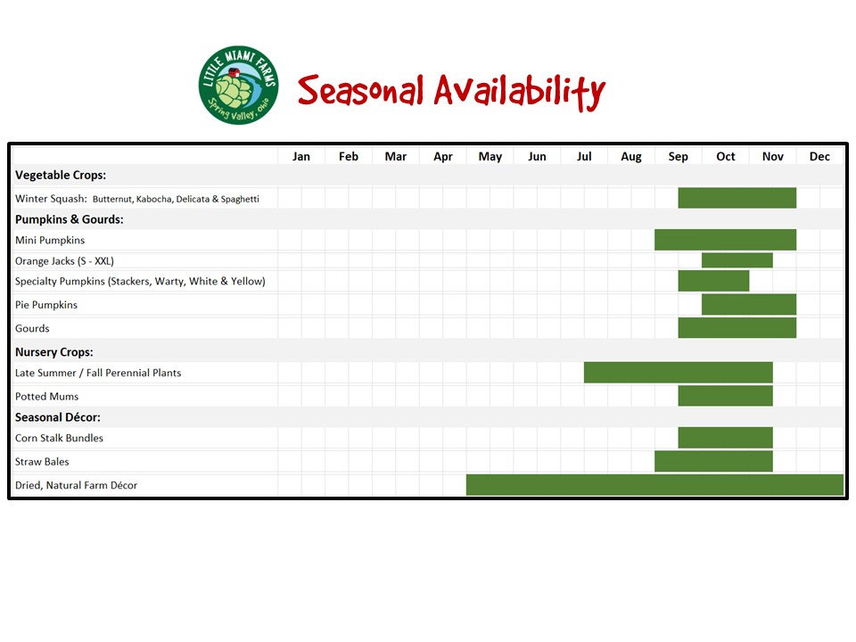 Our in-season chart lists what we grow and when it is available. Please visit us this fall (2026 dates/hours TBA) to purchase straight from the farm or give us a call 937-367-1077 / contact us if you would like to place an order.
